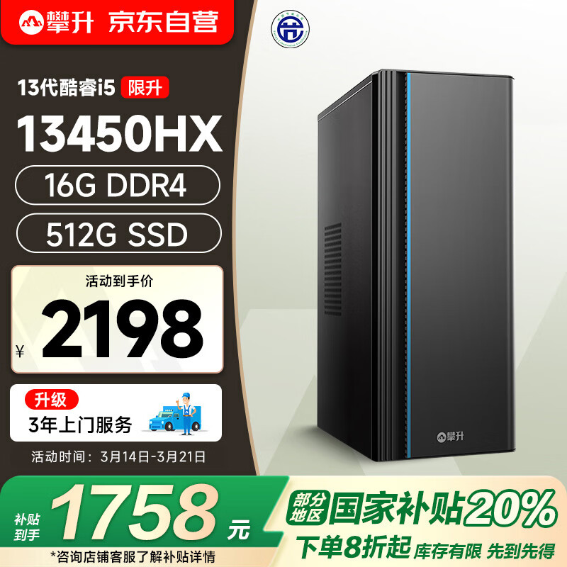 京东攀升商睿 3 国家补贴 20% 办公商用家用台式电脑台式机电脑主机全套整机(13 代酷睿 i5 16G 512G WiFi6)2198 元直达链接攀升商睿 2 Pro