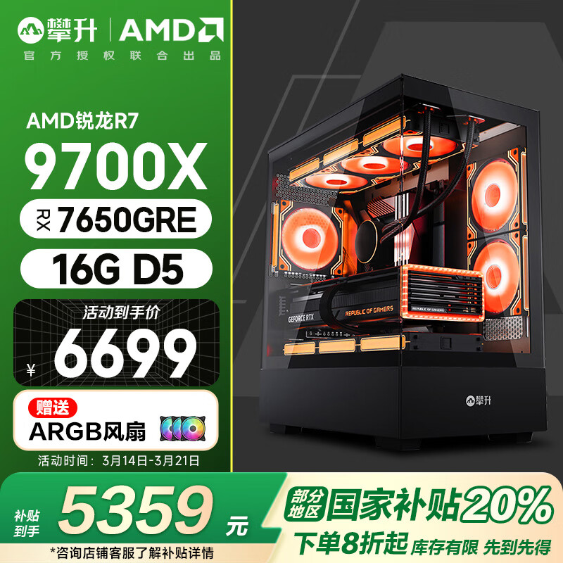京东攀升 & AMD 战神 RS 台式电脑游戏台式机电脑主机全套(AMD 锐龙 R7-9700X 16GD5 1T RX7650GRE)国家补贴 20%6699 元直达链接攀升战神 RS